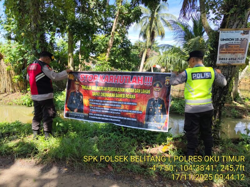 Pada hari Senin, 17 November 2025, Polsek Belitang I kembali menunjukkan komitmennya dalam menjaga keamanan wilayah dari ancaman kebakaran hutan dan lahan (Karhutla). Bertempat di Desa Harjowinangun, personil Polsek Belitang I melaksanakan kegiatan pemasangan banner Larangan Membakar Hutan dan Lahan sebagai langkah preventif menghadapi musim rawan kebakaran.