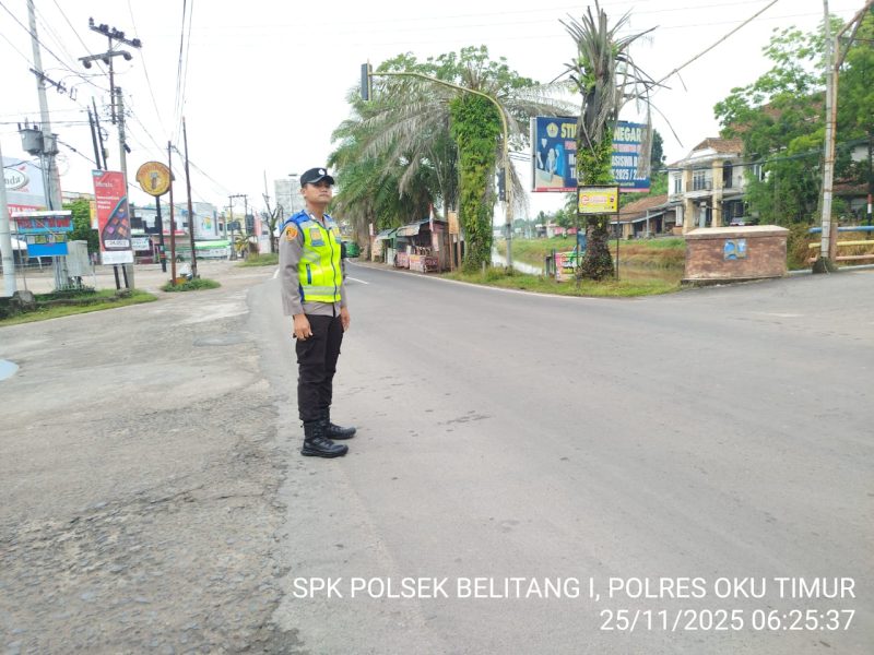 BELITANG, OKU TIMUR – Ketika sebagian besar warga baru bersiap memulai aktivitas, Personil Polsek Belitang I sudah berada di jantung keramaian. Pada Selasa, 25 November 2025, tepat pukul 06.30 Wib, Brigadir Endi Saputra dan Brigadir Markus Erlangga, S.H., secara sigap menempati Simpang Tugu KTM, salah satu hotspot lalu lintas terpadat di Jalan Raya Belitang, untuk melaksanakan giat Strong Point.