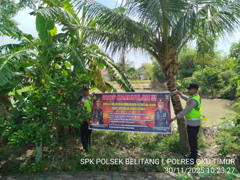 Belitang – Personil Polsek Belitang I, Aiptu Irwan Irwandi dan Brigadir Endi Saputra, melaksanakan kegiatan sosialisasi dan pemasangan banner larangan Kebakaran Hutan dan Lahan (Karhutla) secara serentak di wilayah Desa Sidogede, Kecamatan Belitang, pada Jumat (30/11/2025). Tindakan ini menegaskan komitmen Polres OKU Timur untuk menekan angka Karhutla di wilayahnya.