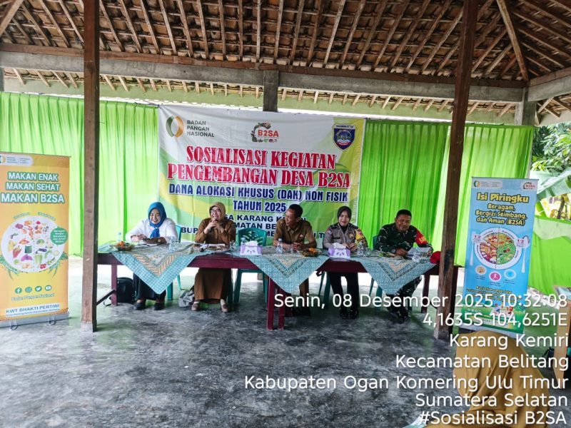 OKU Timur – Upaya serius dalam mewujudkan masyarakat yang Beragam, Bergizi, Seimbang, dan Aman (B2SA) terus digencarkan. Desa Karang Kemiri, Kecamatan Belitang, menjadi lokasi strategis pelaksanaan Sosialisasi Kegiatan Pengembangan Desa B2SA yang didanai DAK Nonfisik Tahun 2025 pada hari Senin, 8 Desember 2025.