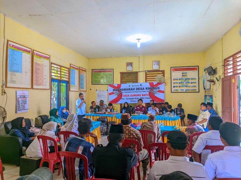 Kepala Desa Gunung Batu, Bpk. Hasanuddin, memimpin jalannya kegiatan didampingi oleh Ketua BPD dan perangkat desa. Hadir pula narasumber penting, Ibu Eka Nurhidayah selaku Pendamping Koperasi Merah Putih, serta para pendamping desa dan tokoh masyarakat setempat.
