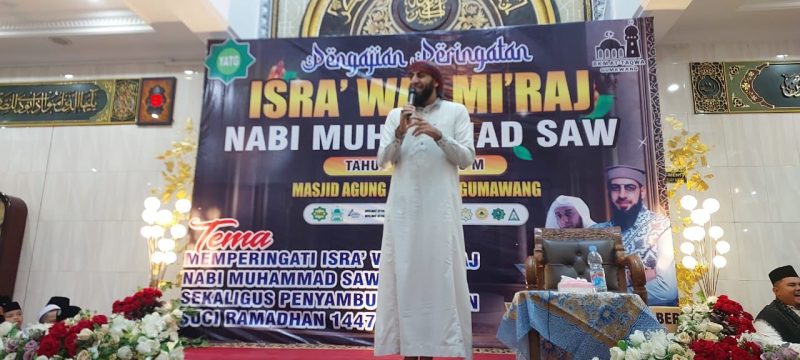 Minggu malam (25/01), suasana di Masjid Agung At-Taqwa Gumawang terasa begitu teduh dan religius. Ratusan warga Kecamatan Belitang berkumpul dalam satu barisan untuk memperingati Isra’ Wal Mi’raj 1447 H sekaligus menyongsong datangnya bulan suci Ramadan. Acara tahunan yang rutin digelar oleh BKM At-Taqwa ini menjadi istimewa dengan kehadiran ulama kondang dari Jakarta.